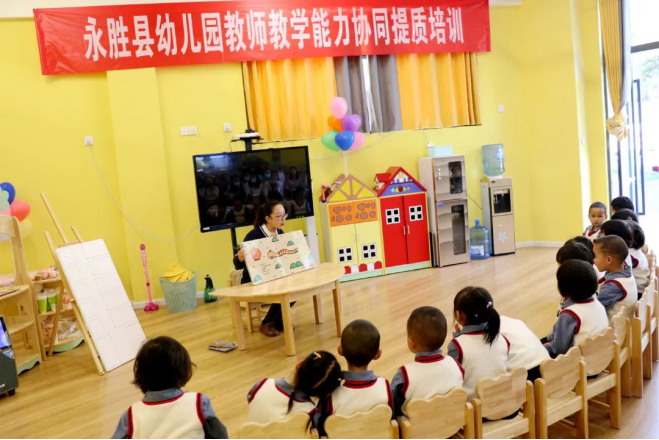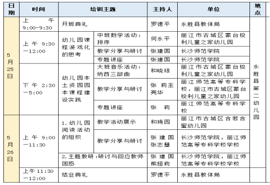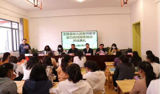 百年大计,教育为本,教育大计,教师为本。为帮助永胜县广大幼儿园教师解决教学工作的困惑,促进教师专业能力提升,进一步推进永胜县学前教育事业均衡、优质发展,提升永胜县幼儿园保教质量,基于永胜县幼儿教师专业发展需求调研基础上,丽江师范高等专科学校(以下简称丽江师专)挂职干部、长沙师范学院《学前教育研究》编辑部主任张建国,引领并组建学前教育志愿者团队,于2022年5月25日至26日,赴永胜县开展幼儿园教师教学能力协同提质培训。志愿者团队共13人,由丽江师专学前教育学院教师、古城区蒙台梭利儿童之家幼儿园教师和含若含蜜幼儿园教师组成。此次活动得到了永胜县教育体育局和永胜县第二幼儿园的大力支持。