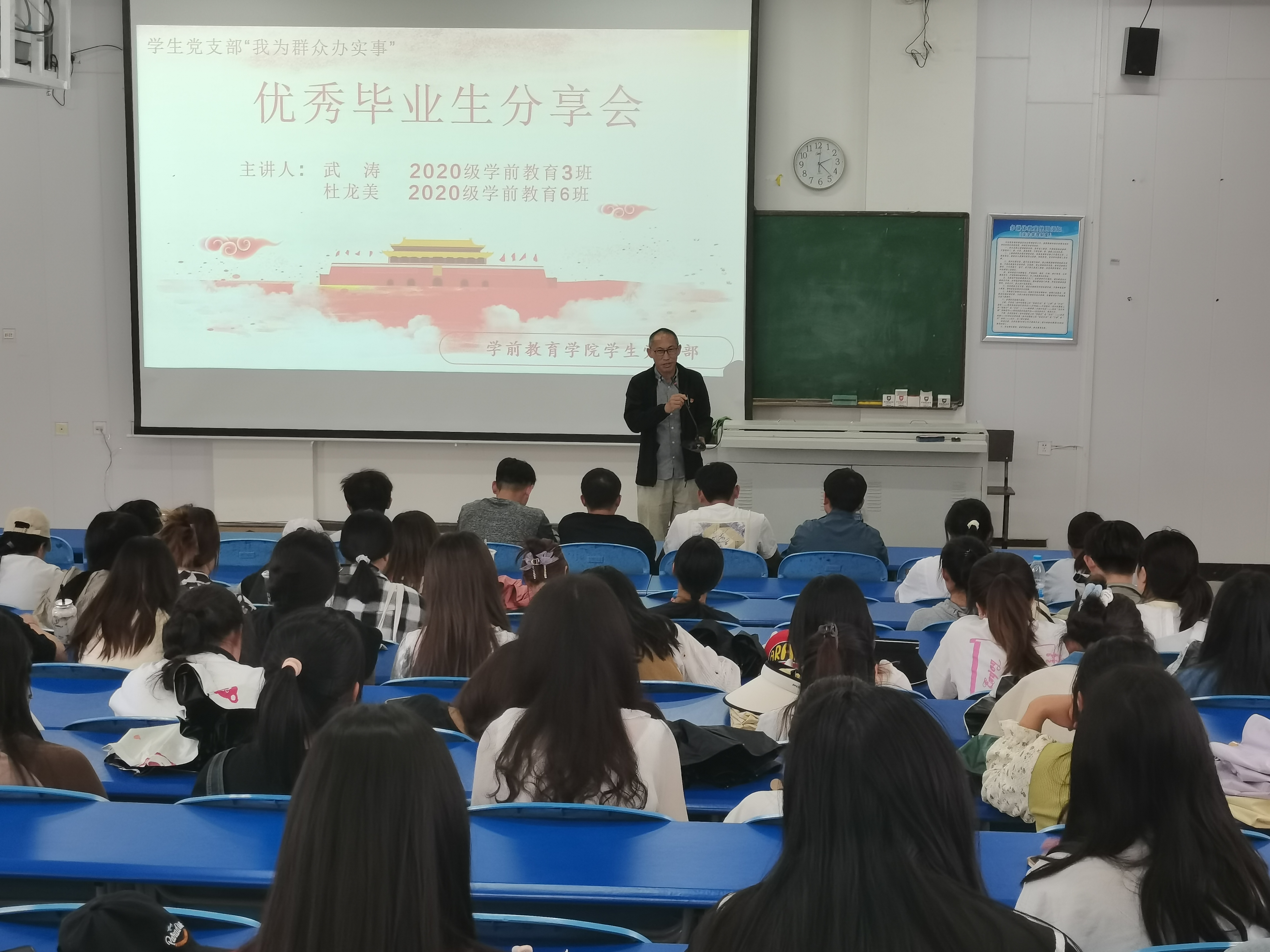 为深入学习贯彻党的二十大精神,让“我为群众办实事”实践活动走深走实,学前教育学院学生党支部坚持把学习贯彻党的二十大精神同解决群众实际问题相结合起来,为更好地将学习成果服务于广大学生,学前教育学院学生党支部于2023年6月2日下午14:00在博学楼222教室开展优秀学生入党积极分子学习经验分享交流活动。此次活动由学生党支部书记李丽梅主持,整个活动由辅导员郭龙、和春婷和专职组织员杨春耀牵头组织,两名优秀的入党积极分子武涛、杜龙美做经验分享,全体入党积极分子及2021级、2022级有专升本意向的同学参加本次活动。