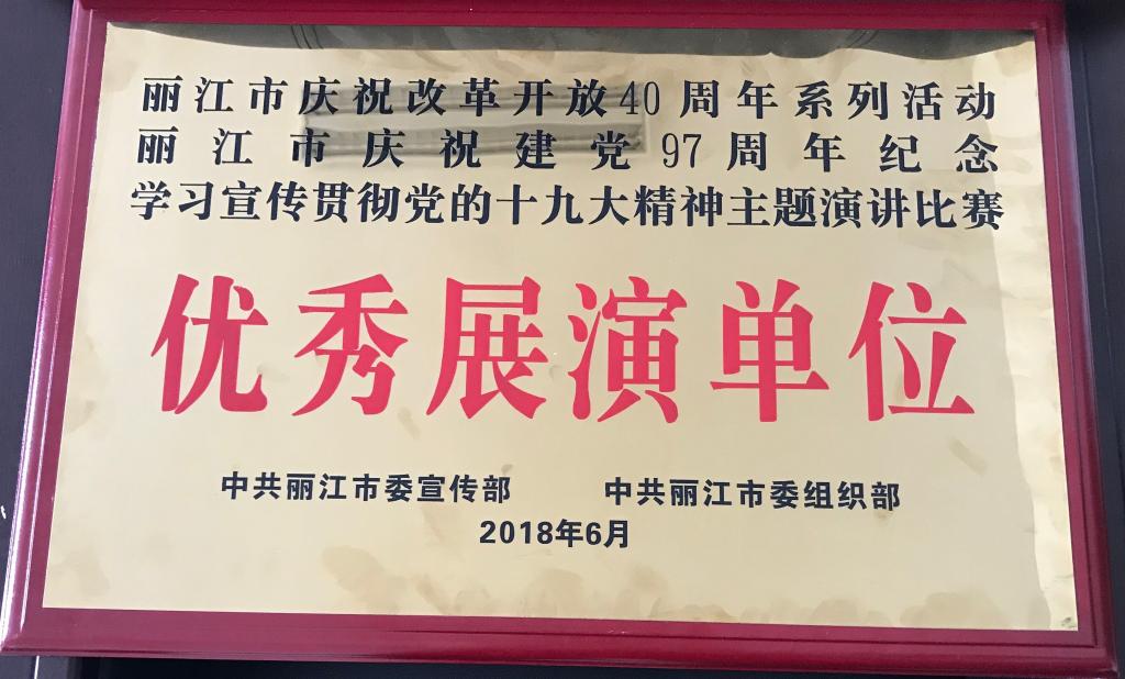 丽江市庆祝改革开放40周年系列活动丽江市庆祝建党97周年纪念,学习宣传贯彻党的十九大精神主题演讲比赛于6月28日举行,学前教育学院教师李艳婷受邀演唱歌曲《不忘初心》,我院荣获“优秀展演单位”称号,此次活动由市委组织部、宣传部主办。