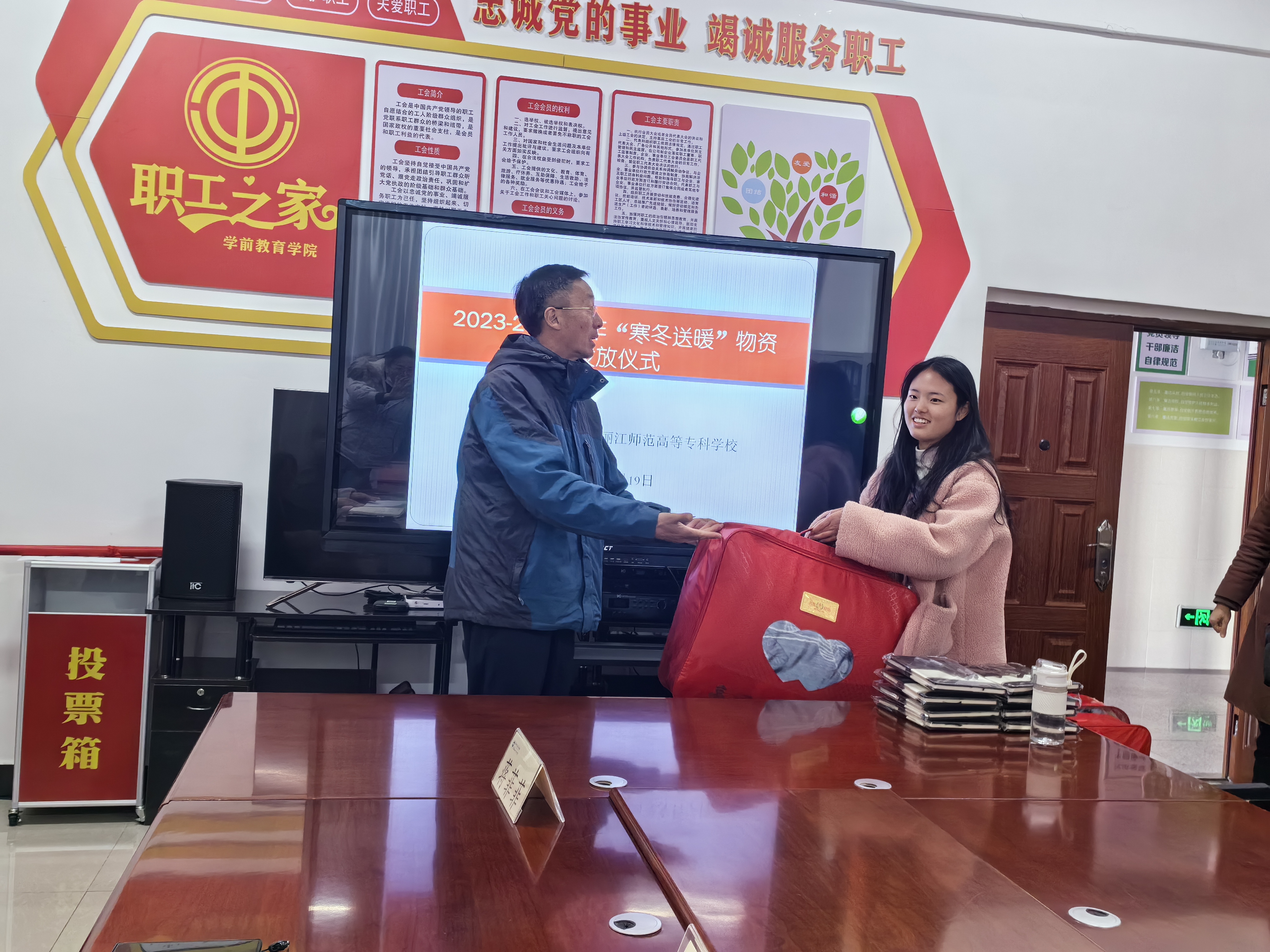 2023年12月19日,在求是楼407会议室,学前教育学院组织发放了“寒冬送温暖”的物资。物资发放活动上,学院主管学生工作的党总支副书记熊娅莉介绍了此次“寒冬送温暖”工作组织的情况,学院党总支书记吕志刚、院长皮婧为8位同学发放了毛毯、笔记本、笔等学习、生活物资。2021级学生杜蕊作为学生代表发言,她感谢学校对家庭困难学生的关心,并表示今后将更加努力学习,提升自己的专业技能,用自己的学习成果更好的服务社会,为学校争光。