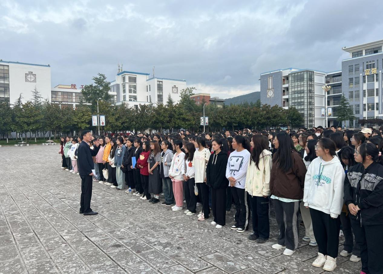 早上6:45分,同学们已经到达丽德广场,有序站好后便等待今天庄严的升旗仪式。全体肃静,国旗护卫队迈着整齐的步伐,护送国旗走向升旗台。伴随着庄严的国歌,鲜艳的五星红旗冉冉升起。2022级学前教育3班的曹锐江作为学生代表在国旗下讲话,她提到92年前震惊中外的“九一八”事变时说“少年强则中国强,希望大家勿忘国耻,缅怀先烈,在民族复兴的新征程上献出自己的力量”。