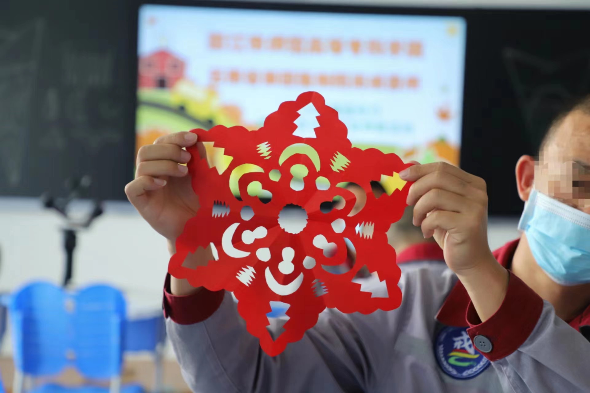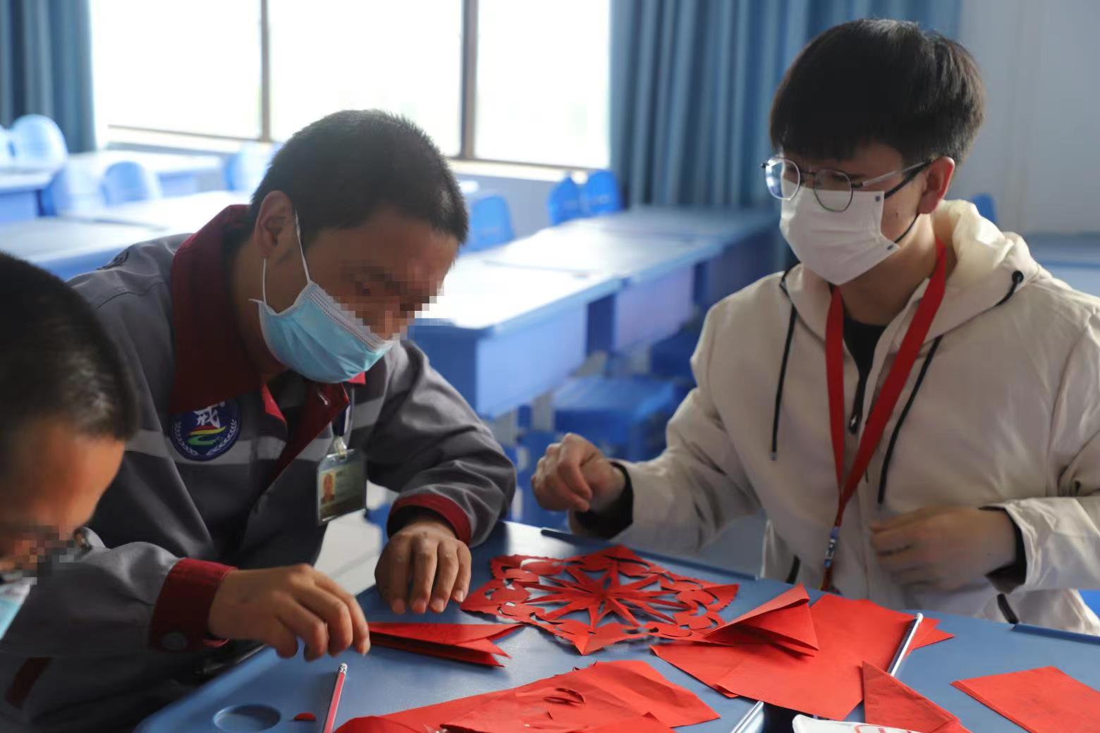 参观完管制人员的生活学习环境后,2022级学前教育1班的鲁宇、蒋仙荣、王刚、徐颖、李润萍同学将参加此次活动的20名管制人员分为5个小组开展剪纸及粘土制作学习活动。同学们带领各自的学员剪团花,制作向日葵、玫瑰等花卉并包装成精美的花束。通过活动的组织,希望参与活动的人员能够在手工制作中感受生活的美,更有勇气面对未来的生活。