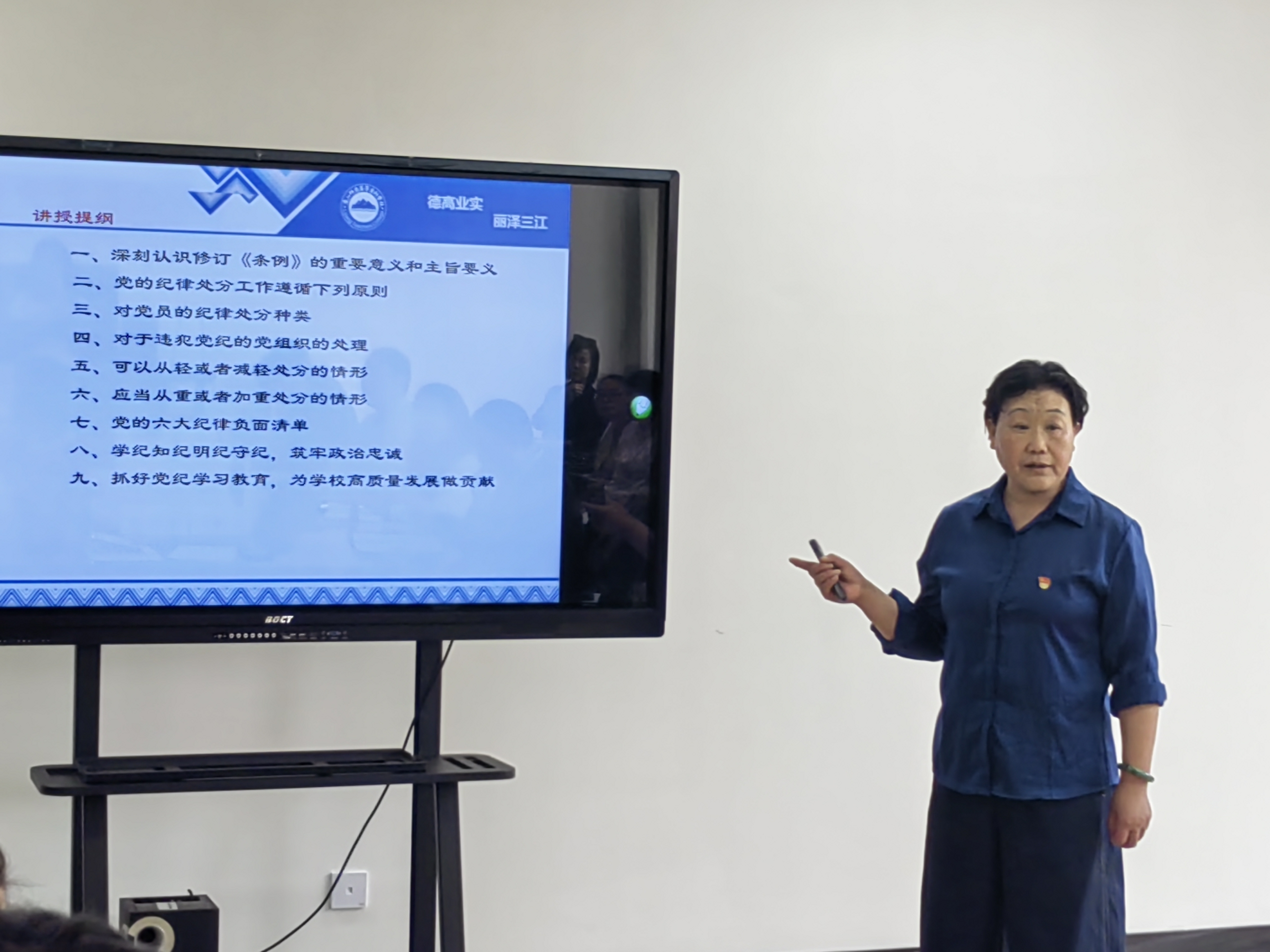 朱桂香围绕最新版《中国共产党纪律处分条例》从深刻认识修订《中国共产党纪律处分条例》的重要意义和主旨要义、党的纪律处分工作遵循的原则、对党员的纪律处分种类、对于违犯党纪的党组织的处理、可以从轻或者减轻处分的情形、应当从重或者加重处分的情形、党的六大纪律负面清单、学纪知纪明纪守纪筑牢政治忠诚、抓好党纪学习教育为学校高质量发展做贡献九个方面进行了讲授。