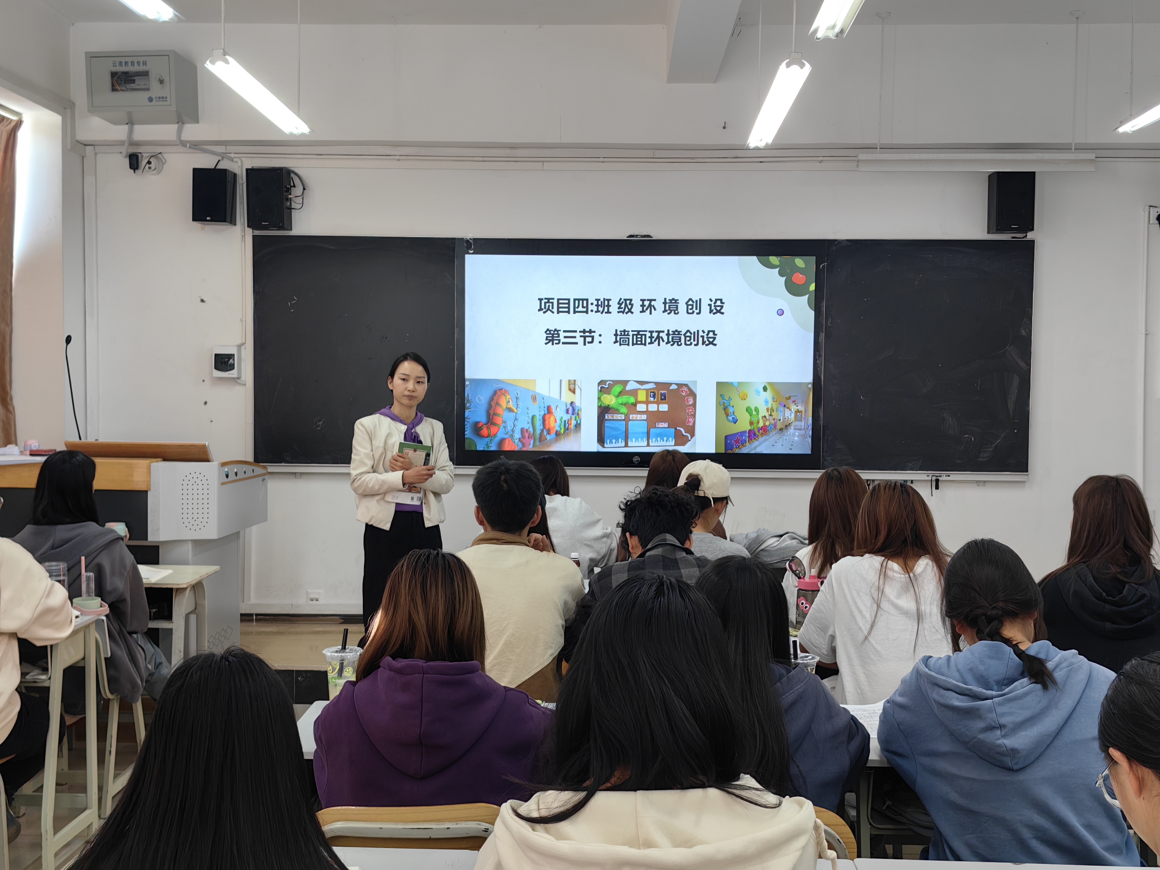 郭丽本节课主讲的内容是“墙面环境创设”,选自学前教育专业必修课程《幼儿园班级管理》中的第四章节“班级环境创设”。郭丽从认知发展、技能发展和情感发展三个方面分析幼儿园墙面环境创设的意义,补充墙面环境创设的原则,重点讲解不同墙面环境创设的方法,并且组织同学们讨论墙面环境创设的误区,最后进行归纳总结墙面环境创设的注意事项。整个教学过程安排合理,从导入到最后的作业布置,流程清晰,时间把控较好。
