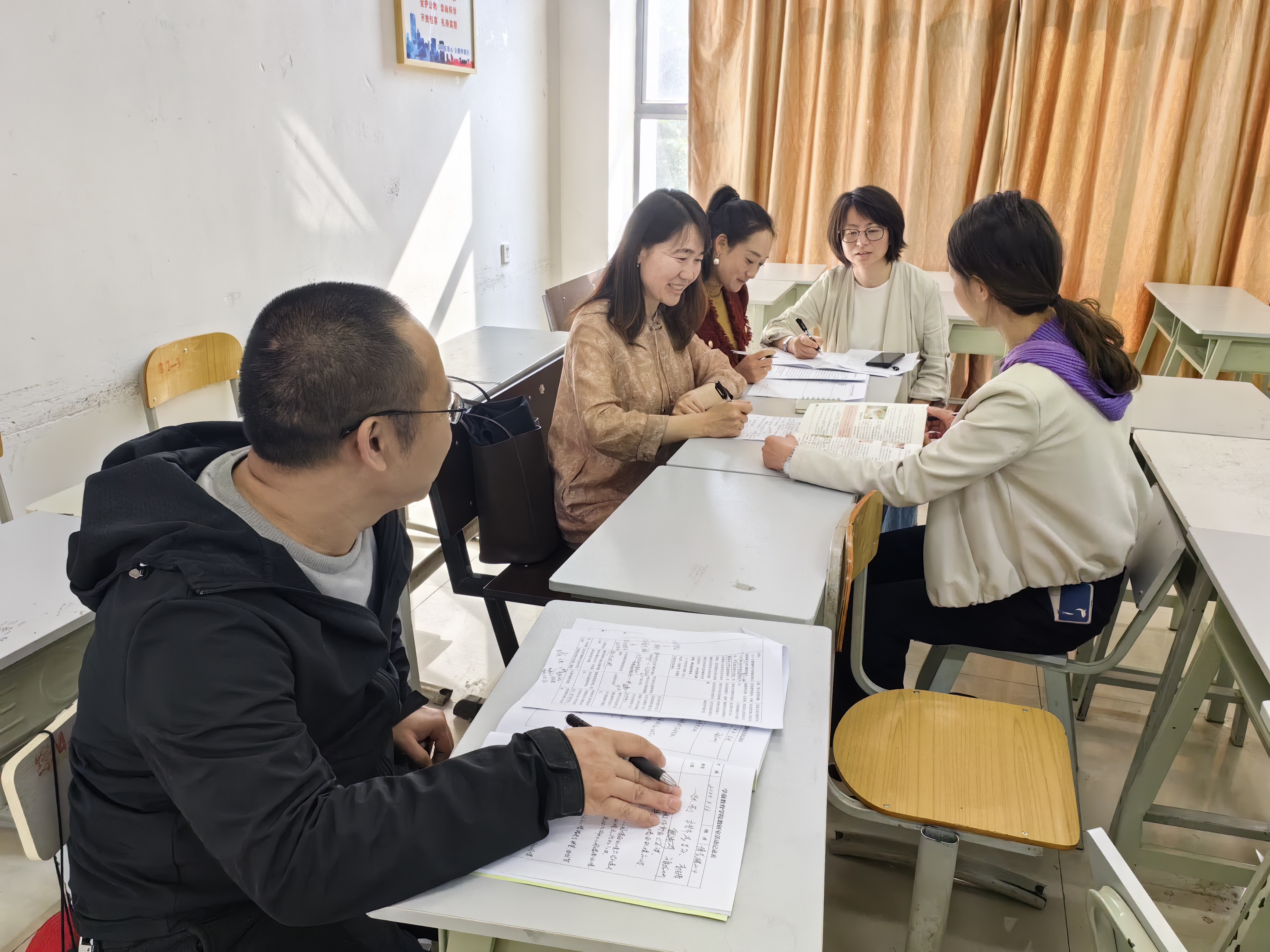 课程结束之后,观摩教学的老师聚在一起就郭丽的整个教学表现进行了研讨。首先是郭丽自己的教学反思,其次是各位老师从教师、学生以及教学三个维度进行点评,最后从多方面对郭丽的教学能力提升提出建议。
