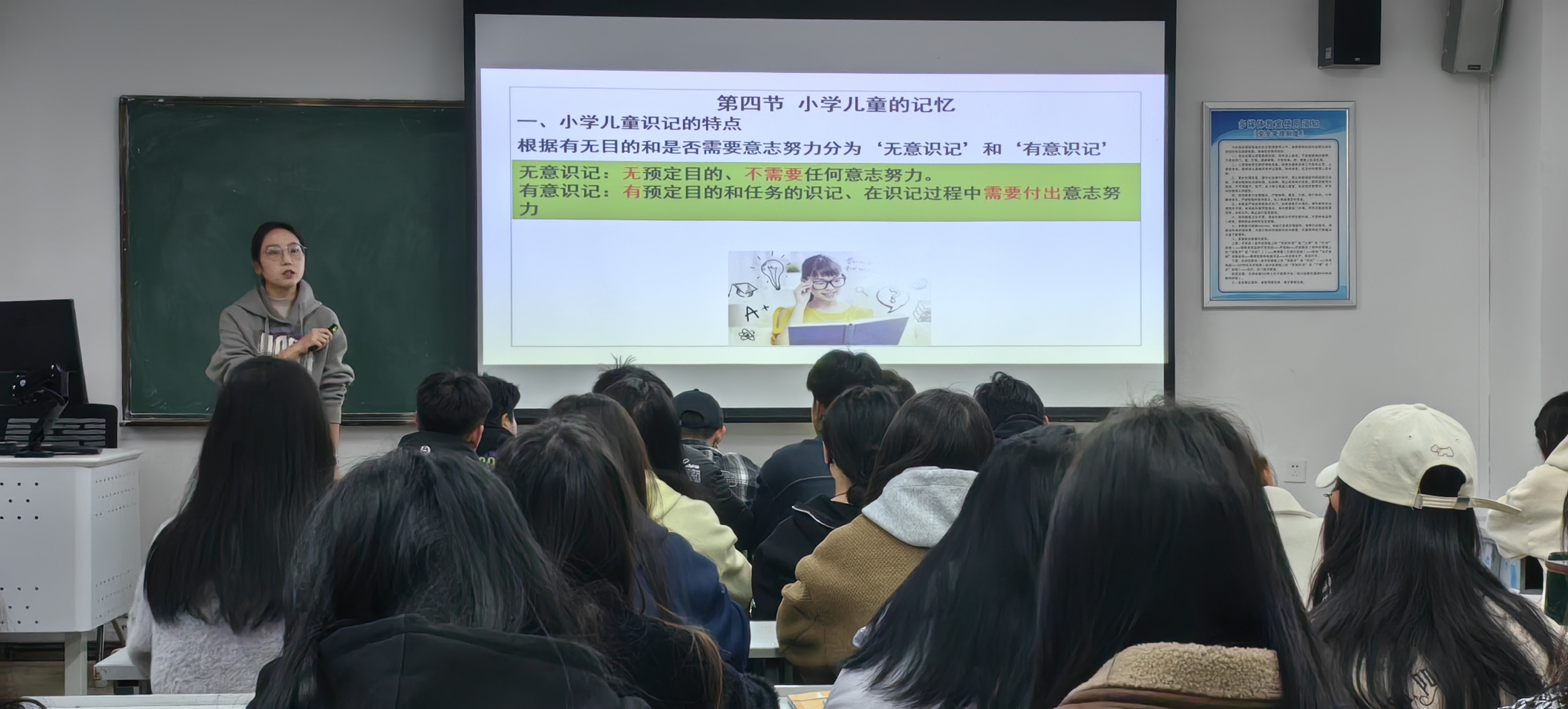 青何艳主讲的课程是《儿童发展与教育心理学》,本次教学活动的内容是小学儿童的记忆。青老师课前做了充分的教学准备,教学从复习记忆的三大环节(识记、保持和回忆)知识点进行导入,通过讲授和数据分析带领同学们学习了小学儿童回忆三大环节的特点,最后结合优秀视频教学和同学们一起总结“如何利用小学生记忆的特点进行教学”。青何艳老师的教学既有理论阐述又有实例论证,更好地让学生们理解和掌握知识,让学生将所学知识运用于教学实践中,这极大地提升了学生的专业技能水平。