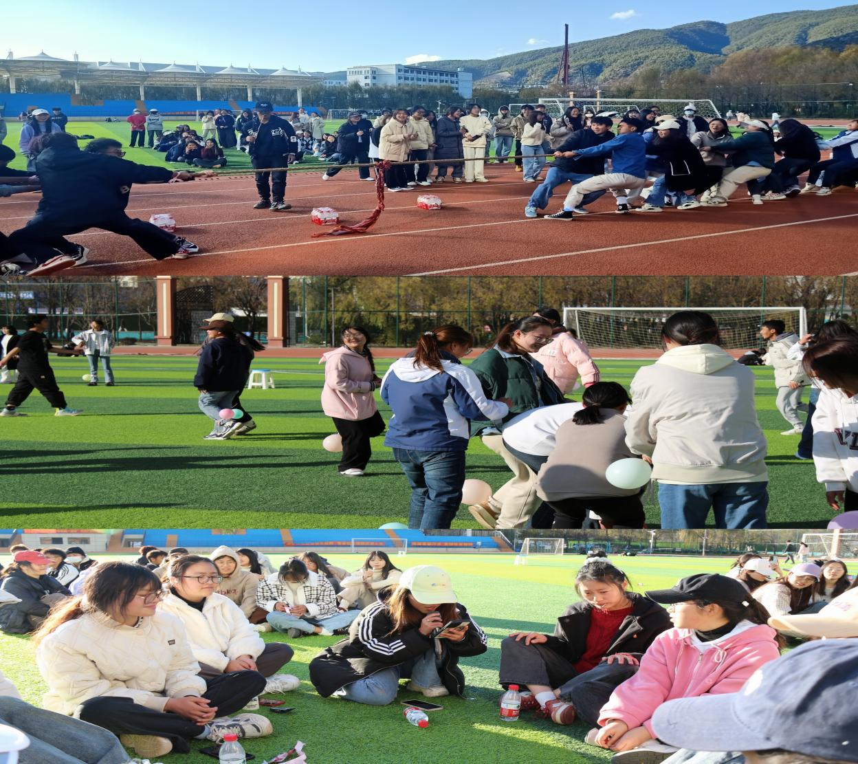整个活动分为三个精彩的游戏环节:集体拔河、小组竞技和猜歌名。集体拔河比赛点燃了每一位同学的激情现场气氛热烈,这不仅培养了团队协作能力,还增强了彼此之间的亲近感。进行踩气球游戏时田径场上气球被踩爆的“嘣嘣嘣”声中夹杂着同学们肆意张扬的笑,大家不管是否熟识,看到对方有气球就去踩,战况十分激烈。不同于前两个游戏,猜歌名时大家围坐一起,边举手抢答边放声高歌,在欢快的氛围里大家更好地了解对方。