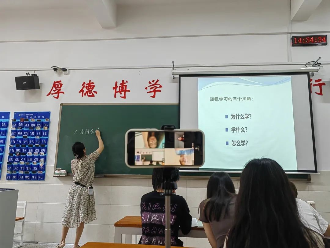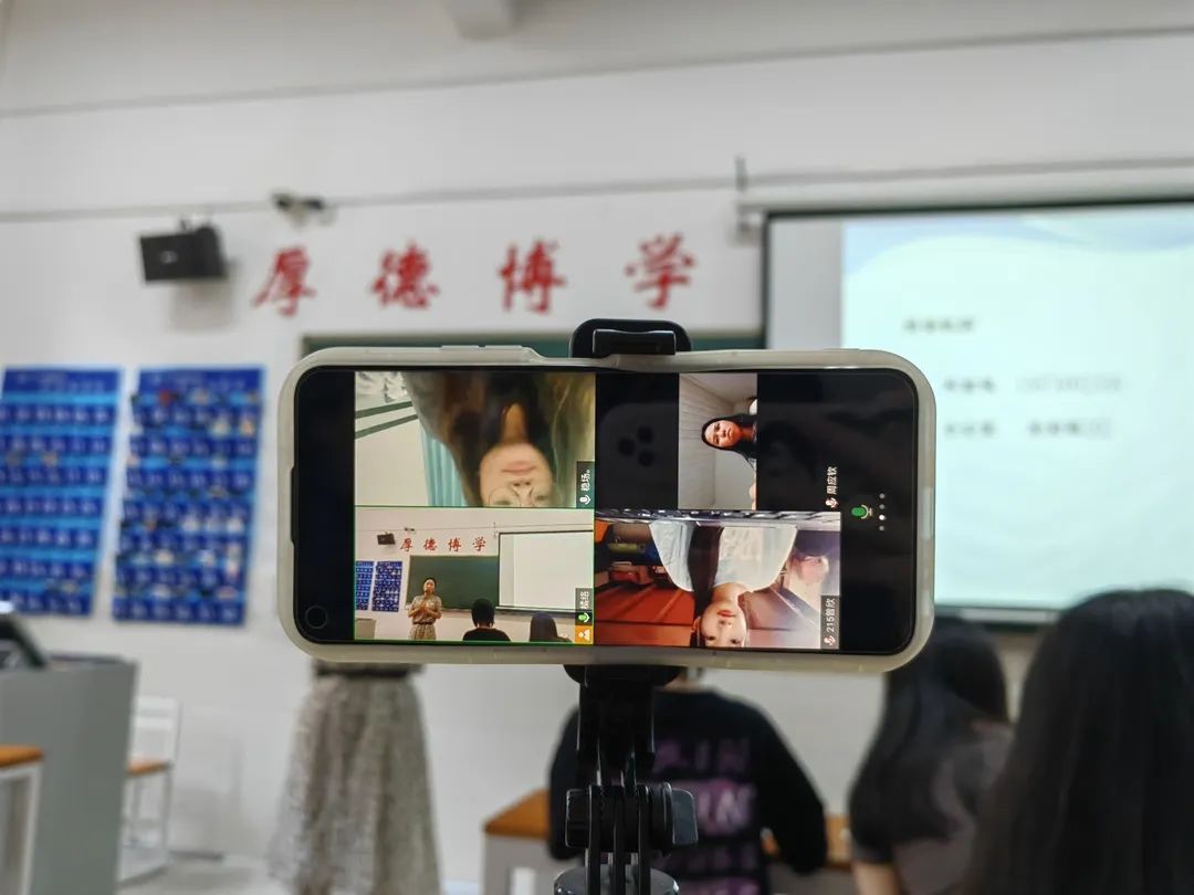 2022年新学期,在学前楼216教室“C位”落座的是一个手机支架和一部正在实时直播的手机,摄像头正对准黑板和多媒体屏幕,教室里坐着的是19学前506班45位同学和正在上课的宋苗境老师,视频彼端是来自丽江师范高等专科学校2021级学前教育1班的八位交流生同学。她们因疫情,无法在开学之际来到长师交流学习,通过网络,他们在距离长师一千三百多公里的丽师开始了特殊的学习之旅。