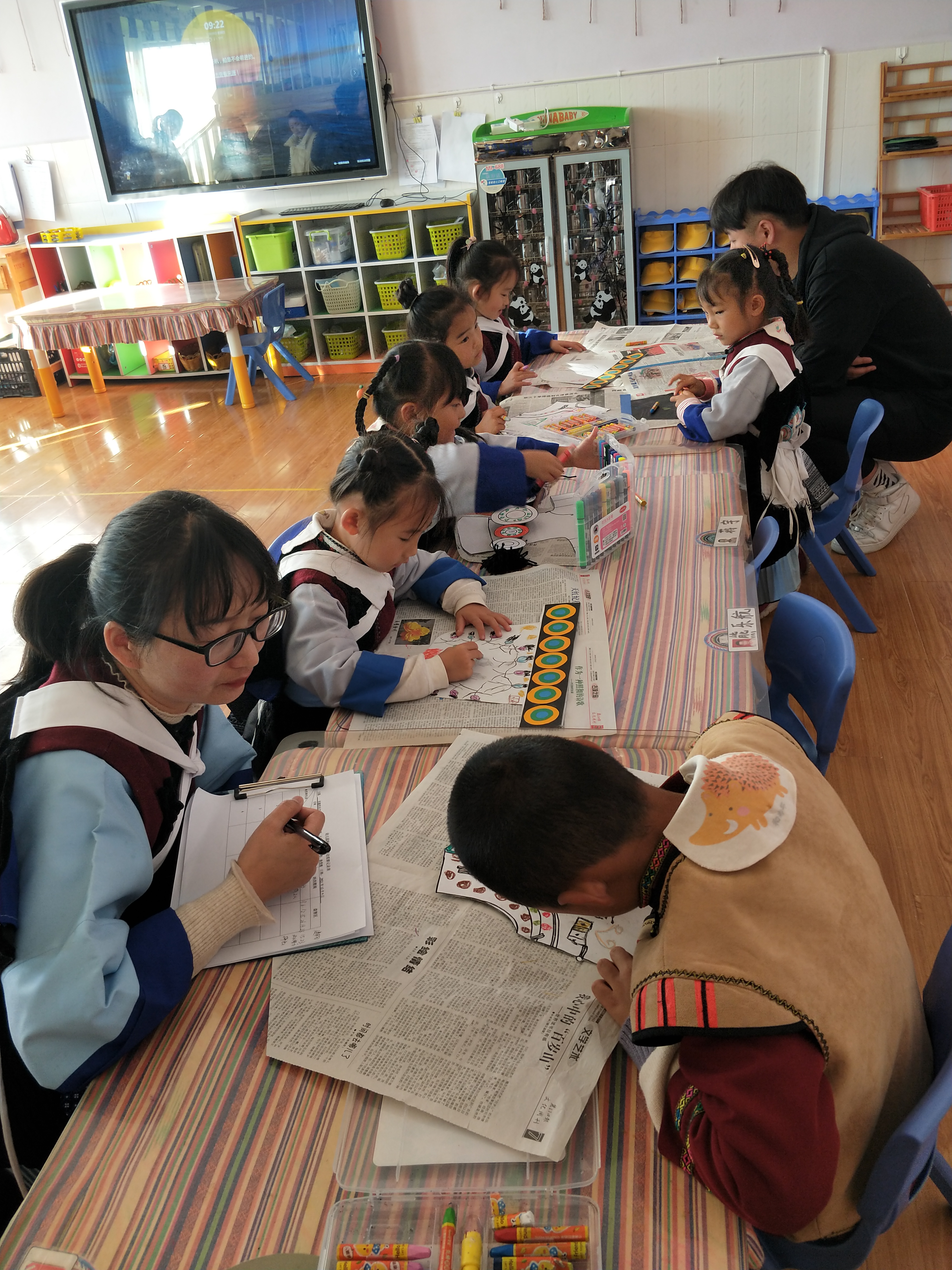 第一阶段:观摩班级民族特色区域活动。参加研讨活动的老师依次观摩了两个区域活动:有趣的东巴文(大班)、小小设计师(小班)。