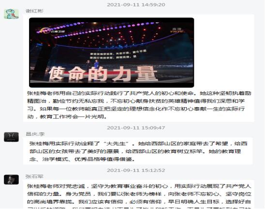 为深入学习贯彻习近平新时代中国特色社会主义思想和党的十九大精神,学习先进典型,弘扬高尚师德,发挥榜样示范引领作用。根据《中共云南省委教育工委办公室关于组织收看张桂梅思政大讲堂第四讲的通知》要求,2021年9月11日,学前教育学院全体师生自行观看学习《张桂梅思政大讲堂》,学院教师纷纷在学院工作群中谈自己的心得体会。