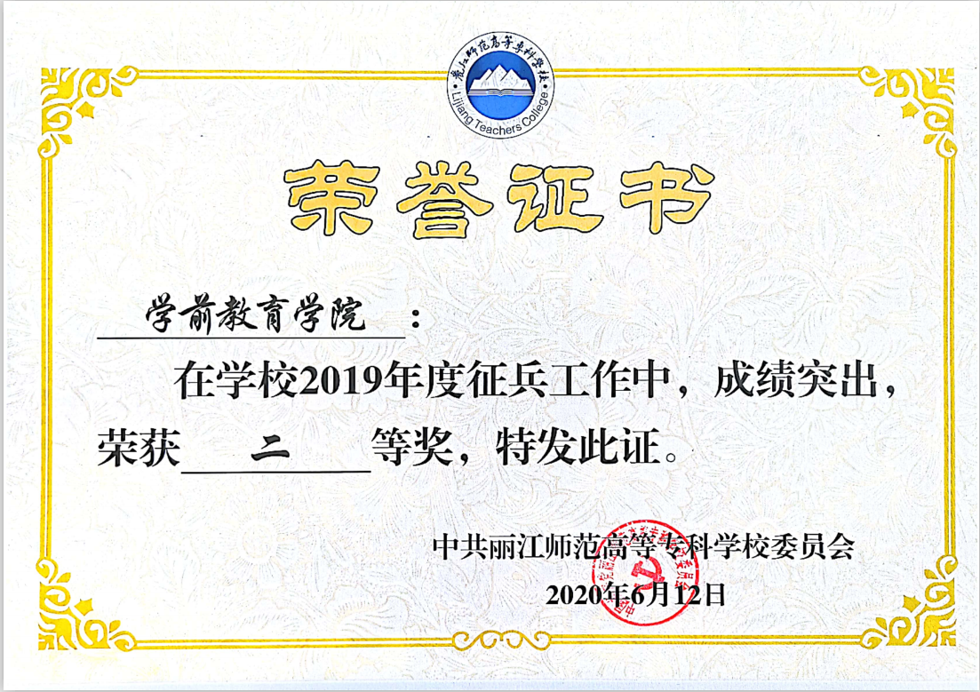 2019年学前教育学院超额完成征兵任务,荣获学校征兵工作二等奖。