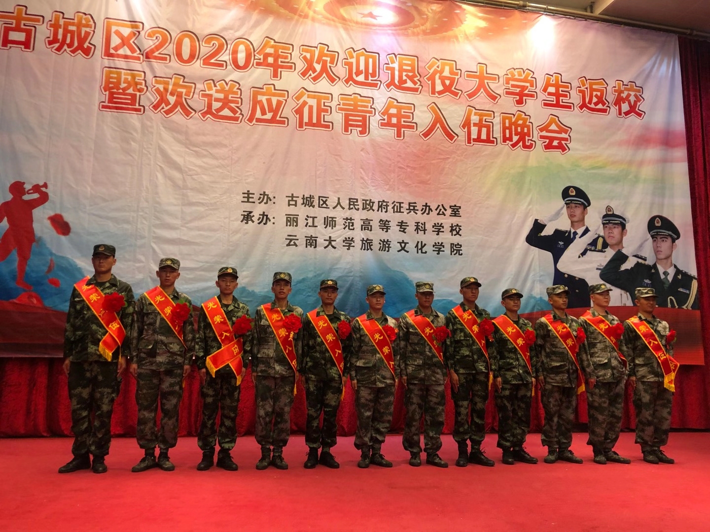 2020年9月15日晚,丽江市古城区2020年欢迎退役大学生返校暨欢送应征青年入伍晚会在我校图书馆报告厅举行,学前教育学院2020届毕业生普发彪作为新入伍同学参加晚会。