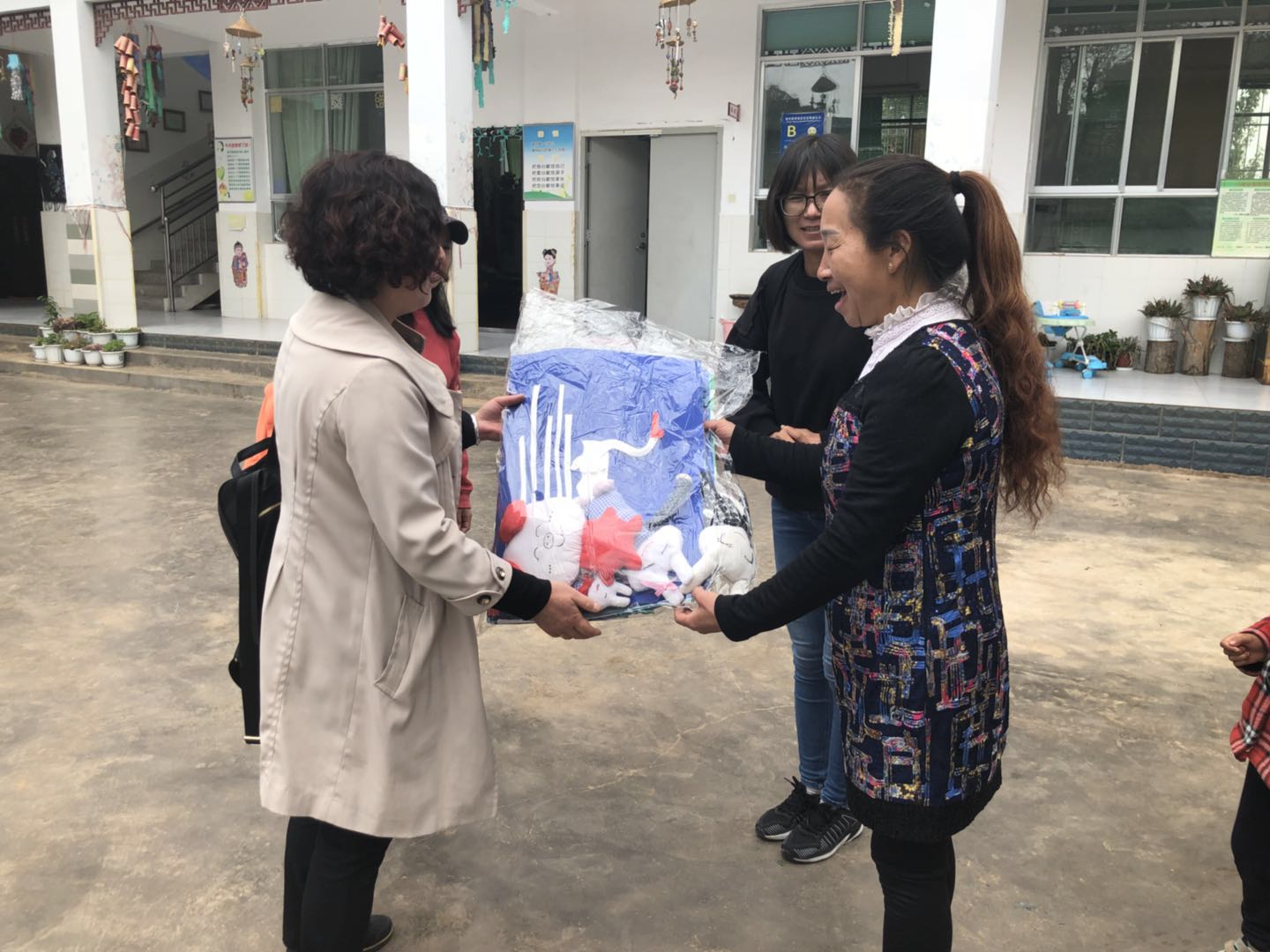 陈老师一行3人到达龙应村后,在玉龙县本地社会公益组织——和心社区发展服务中心的带领下参观了龙应幼儿园,并给幼儿园和儿童之家赠送了一批手工作品和玩具。之后,两位青年教师在幼儿园分别组织了教育活动,龙应幼儿园全体教师观摩了活动。陈亚庆老师组织的蒙台梭利教学活动《金色串珠》让孩子们初步感知了数字与实物(数量)的对应关系,并尝试与同伴合作完成操作探索活动,体验成功感。李诗洋老师组织的健康活动,使孩子们侧身行走的能力得到了训练,体验了合作游戏的快乐。