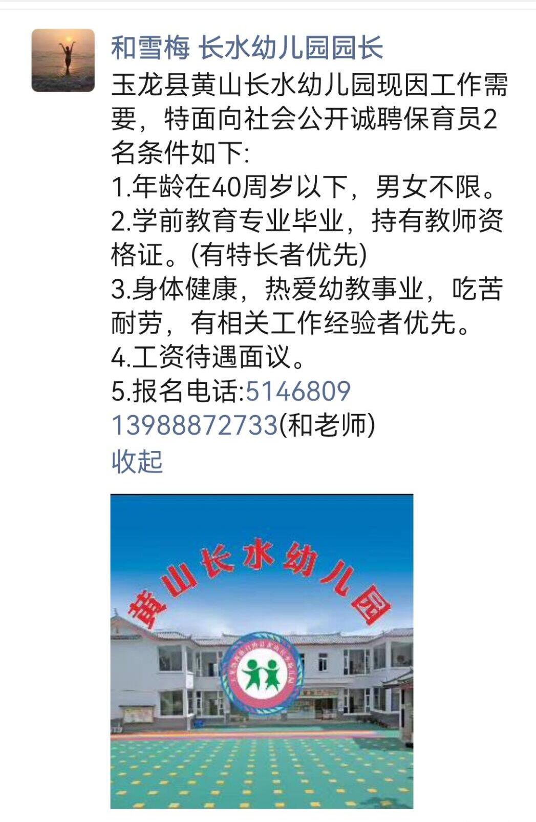 招聘信息|玉龙县黄山长水幼儿园